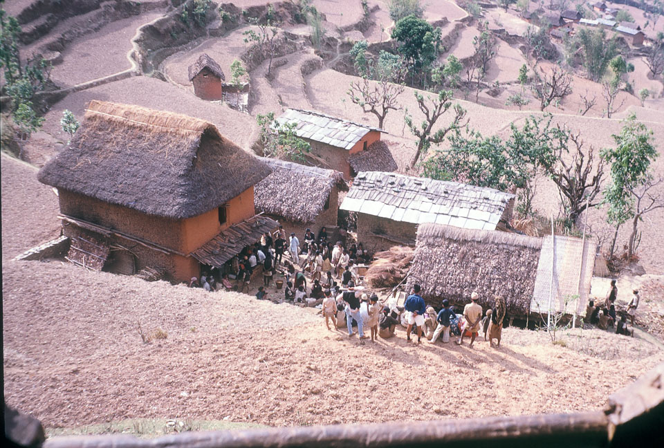 Date: 1969 Location: Chautara, Sindhupalchok Description: View of family gathering at homes below the Chautara bazaar.
