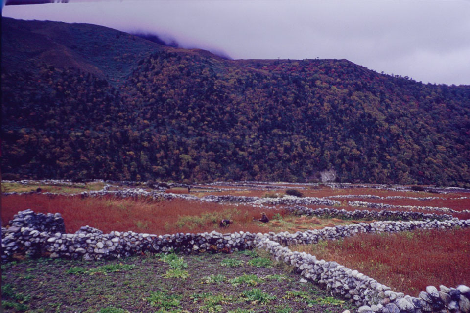 Date: 1968-10 Location: Khumjung, Solukhumbu Description: Farmers beginning harvest in their farm fields.