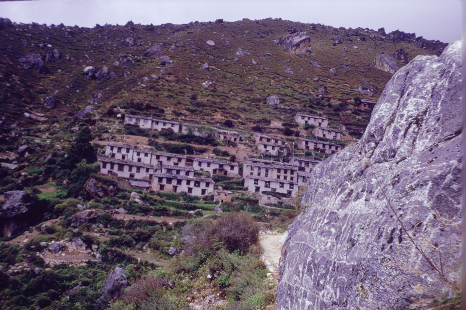 Date: 1968-10 Location: Namche, Solukhumbu Description: Houses in the village with carved mani stone in the foreground.