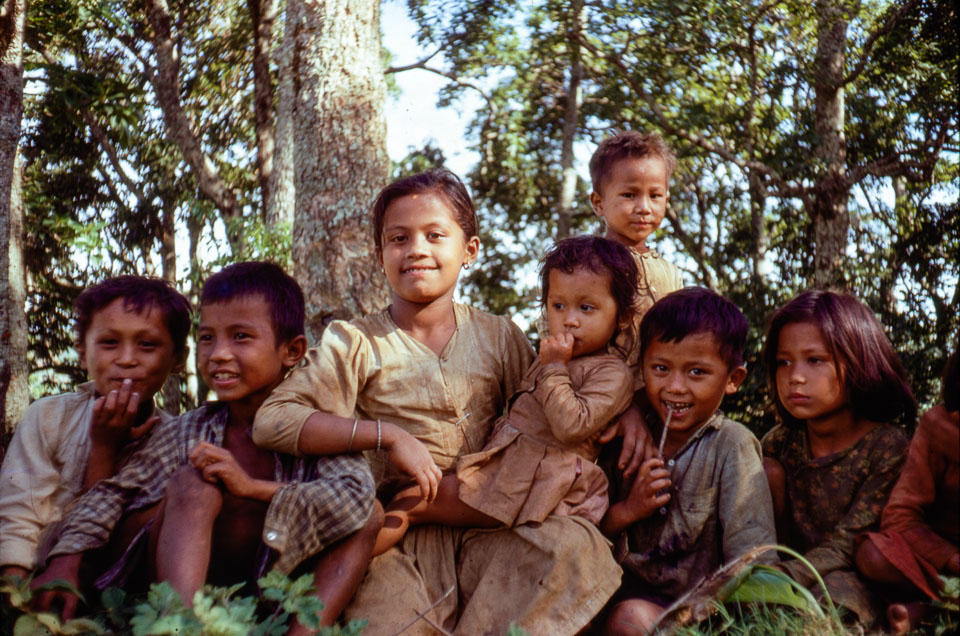 Date: 1969 Location: Chautara, Sindhupalchok Description: Chautara village children sitting just outside bazaar section of the village.