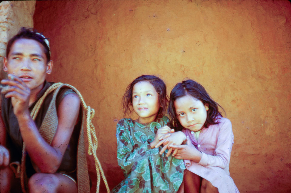 Date: 1969 Location: Chautara, Sindhupalchok Description: Two girls and a boy in Chautara village.