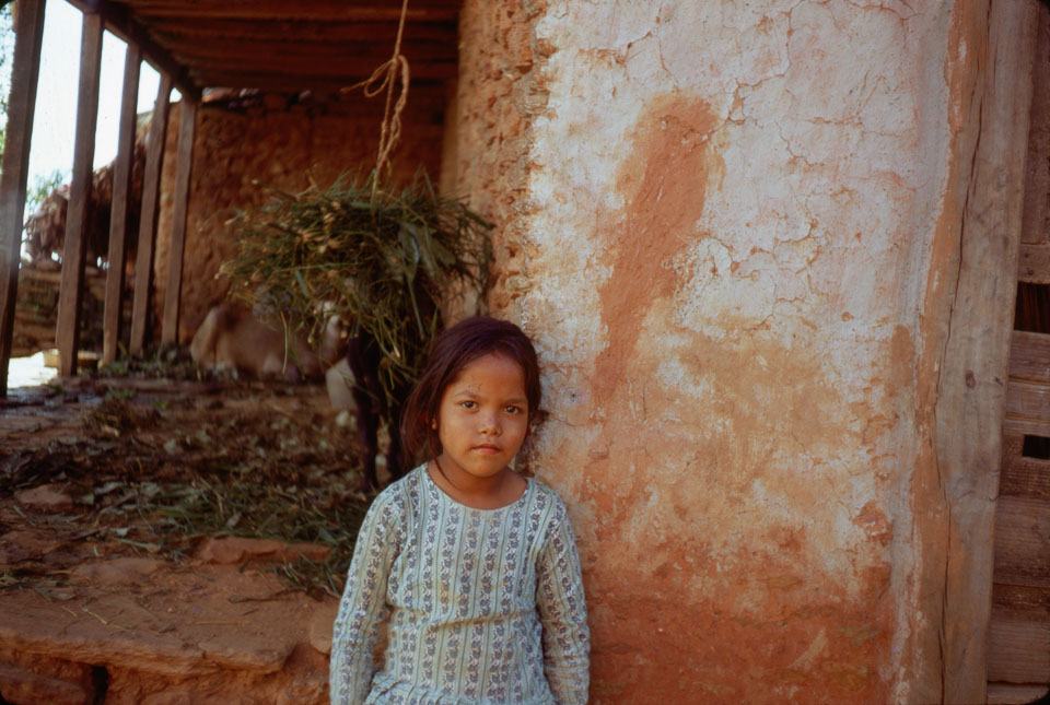 Date: 1969 Location: Chautara, Sindhupalchok Description: A Little girl standing in front of her home with animals eating hay in the background.