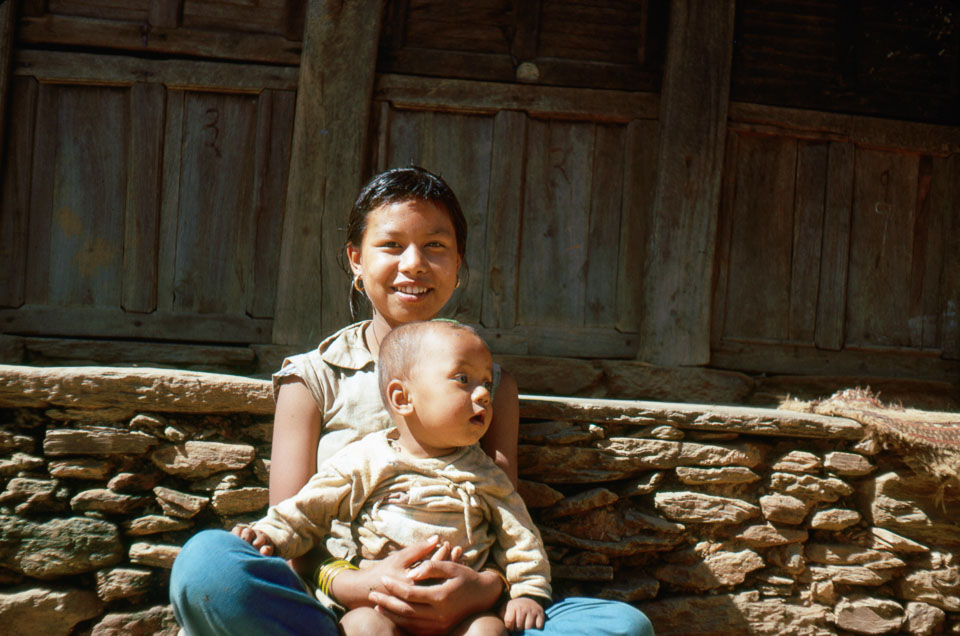 Date: 1969 Location: Chautara, Sindhupalchok Description: Girl sitting in front of a Chautara home holding a baby.