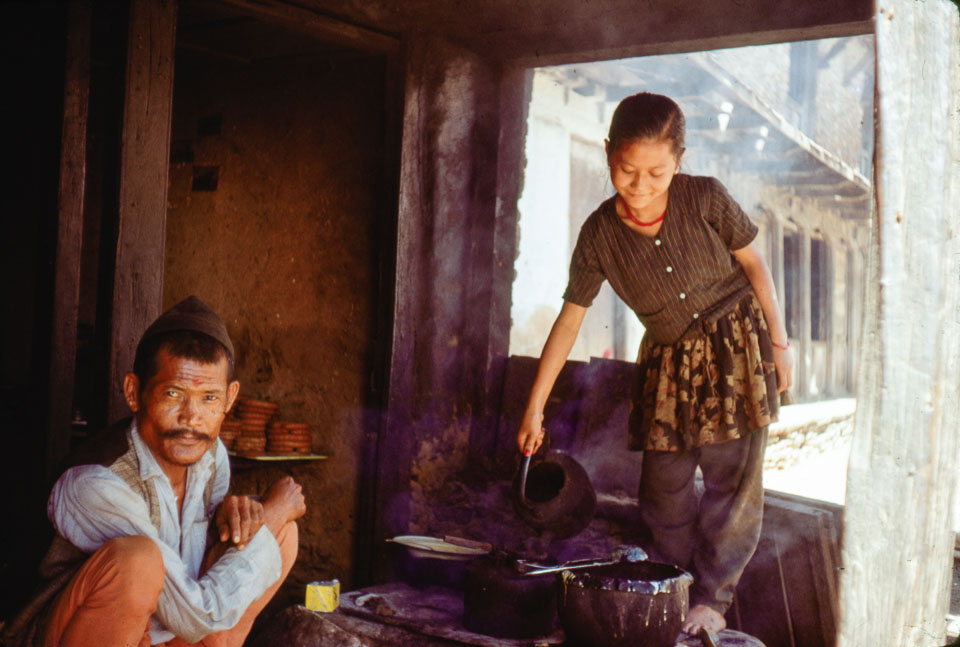 Date: 1969 Location: Chautara, Sindhupalchok Description: Chautara village tea shop with shopkeeper and a young girl pouring tea.