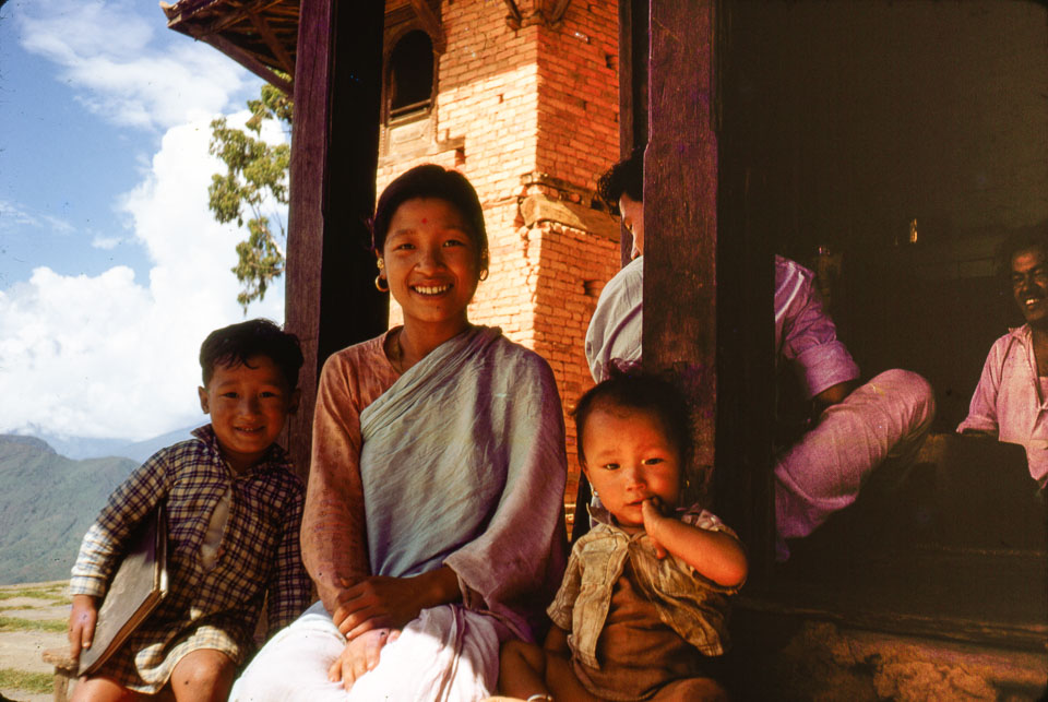 Date: 1969 Location: Chautara, Sindhupalchok Description: Woman with two young children sitting in front of a Chautara shop.