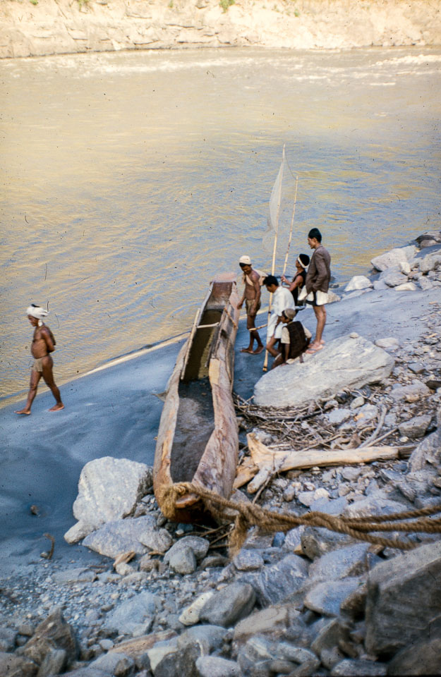 Description: Rough-hewn dugout at the crossing of the Arun River between Dhakuta and Bhojpur districts. In those days, it was hard sometimes even to find the ghat where there might, or might not be a boat waiting. The boats were rough-hewn dugouts. You and any number of others who might have been waiting for several hours crammed yourselves and your belongings into the boat. There was no schedule, of course, and if the water was too high or rapid, it might just not go at all. It's worth noting that, anxious as we were, most of the people with us were even more terrified. No one liked going across since very few villagers could swim.