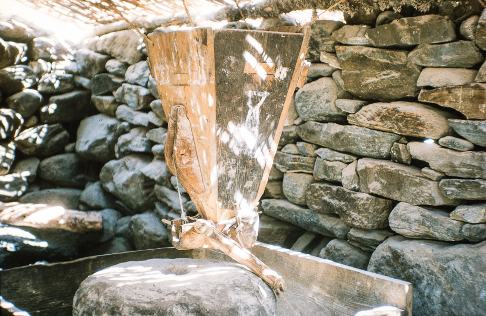 Description: Grain mill in Solukhumbu near a Sherpa village. This was beside a stream where it was water powered by a simple, wooden turbine. The grain (rice or barley) would be dumped into the bin, and released as the wooden trigger bumped up and down in accord with the turning stone. Like old European stones, the grain would then fall into the central hole and be ground as it was rolled outwards toward the periphery. Rigs like this were quite rare in the lower hills, but frequent in Sherpa country. Perhaps where rice grew easily and was preferred boiled, there was no need to grind it, whereas wheat and barley, which grew readily in the north, really needed grinding. Sherpas made a number of different foods from the flour.
