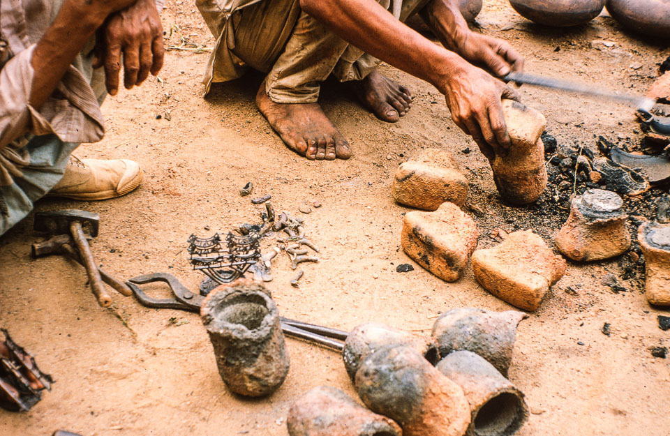 Description: Brass "kachaura" (cups used for serving individual portions of food and for drinking raksi) are broken out of molds after the molten brass has been poured into the molds and the "lost wax" evaporates. The molds are made of "buss" (rice polishings) mixed with clay and manure.