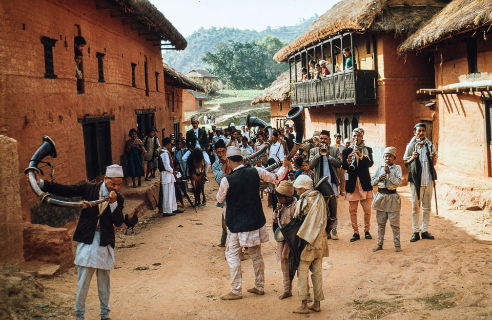 Date: 1964 Location: Bhojpur Description: A Damai ensemble leads a festival procession through a small village bazaar in Bhojpur district.