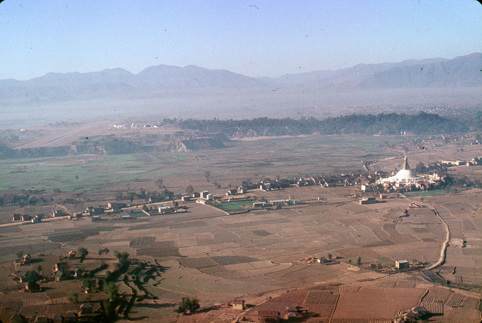 Description: Kathmandu Valley, panorama from the air. Bouddhanath temple and its surrounding houses and monasteries on the right. Tribhuvan Airport terminal and runway at center left. Keywords: Mike Furst, Nepal Photo History Project, Peace Corp Photo History, aerial view, airfield, community, landscape, mani wall, shrine, stupa/chorten, transportation