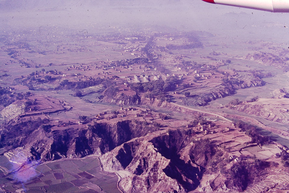 Caption: Date: 1971-04 Location: Bhaktapur Description: Aerial view of Kathmandu valley and Thimi area, on approach to Tribhuvan airport ?? Keywords: Mike Furst, Nepal Photo History Project, Peace Corp Photo History, aerial view, landscape