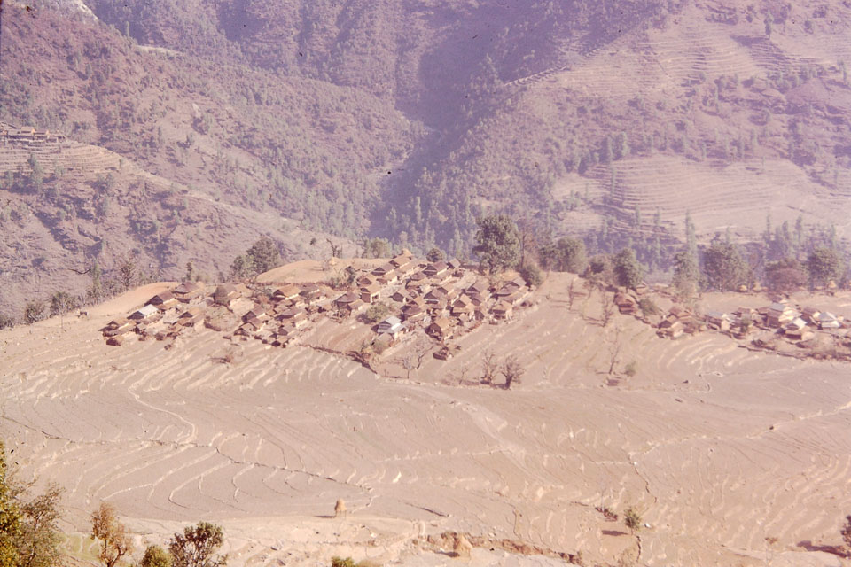 Caption: Date: 1970-05 Location: Lamjung Description: Village and surrounding fields below, on trail to Kunchha and Pokhara. Keywords: Mike Furst, Nepal Photo History Project, Peace Corp Photo History, countryside, landscape, town, village