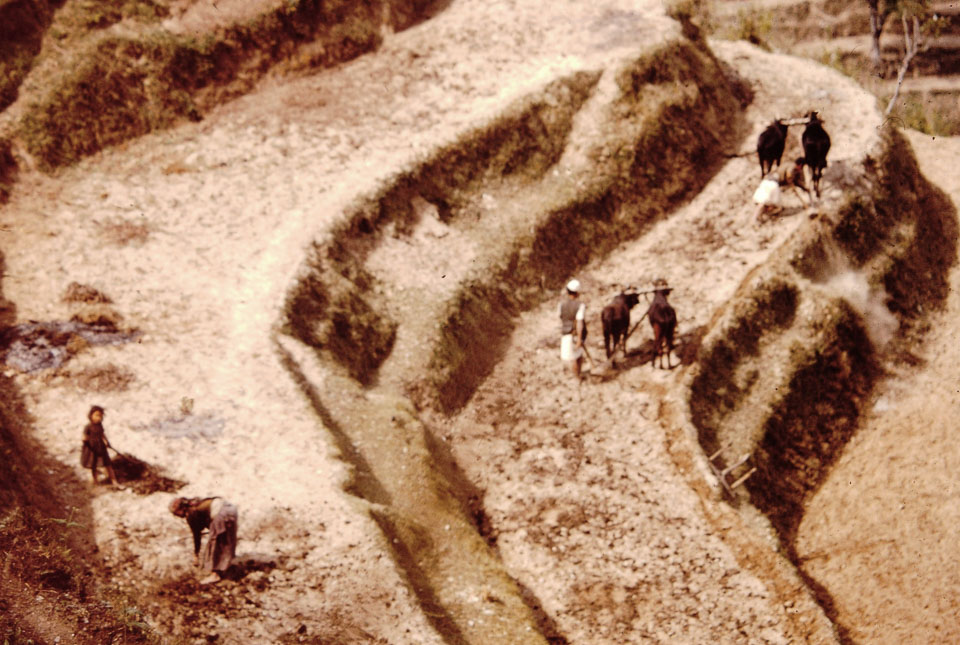 Caption: Date: 1970-05 Location: Lamjung Description: Tilling on terraced hillside, on trail to Kuncha and Pokhara. Keywords: Mike Furst, Nepal Photo History Project, Peace Corp Photo History, agriculture, plowing, tilling