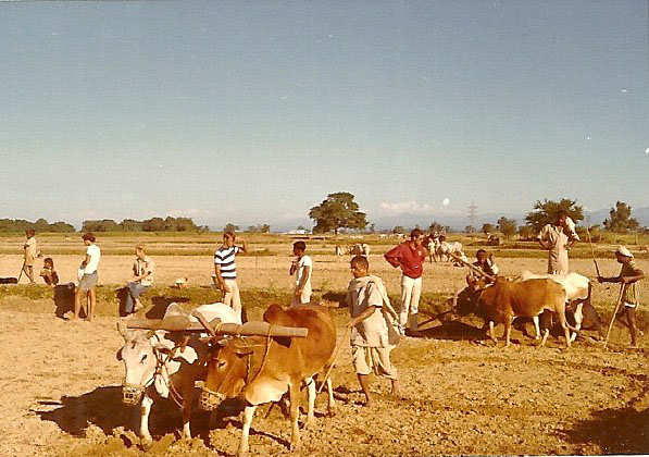 Caption: Date: 1971-02 Location: Birganj, Parsa Description: Farmers and Peace Corps volunteers in training, bullock drawn implements at the Parwanipur agriculture training facility. Foothills and Himalayas, in background. Keywords: Mike Furst, Nepal Photo History Project, PC volunteer, Peace Corp Photo History, People, agriculture, event, plowing, tilling, training event