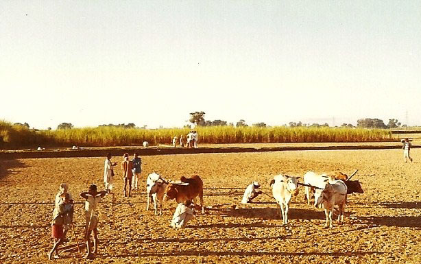 Caption: Date: 1971-02 Location: Birganj, Parsa Description: Farmers and bullock drawn implements at the Parwanipur agriculture training facility. Sugar cane field in the background. Keywords: Mike Furst, Nepal Photo History Project, Peace Corp Photo History, agriculture, animal, event, field, training event