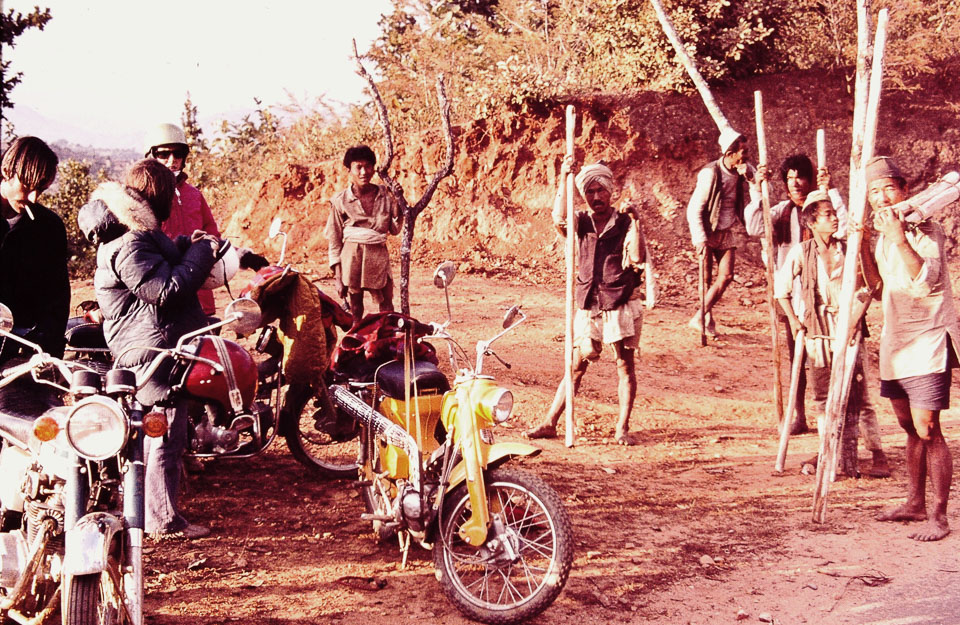 Caption: Date: 1972 Location: Kavrepalanchok Description: Men with sticks meet with westerners on a motorcycle trip to the Sun Kosi river. Peace Corps staff member Hank Lacy far left. Keywords: Mike Furst, Nepal Photo History Project, PC volunteer, Peace Corp Photo History, People, community, motorcycle, named person, road, transportation