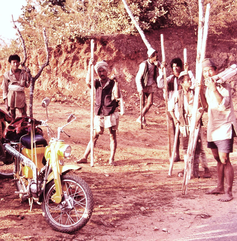 Caption: Date: 1972 Location: Kavrepalanchok Description: Men with sticks meet with westerners on a motorcycle trip to the Sun Kosi river. Keywords: Mike Furst, Nepal Photo History Project, Peace Corp Photo History, community, motorcycle, road, transportation