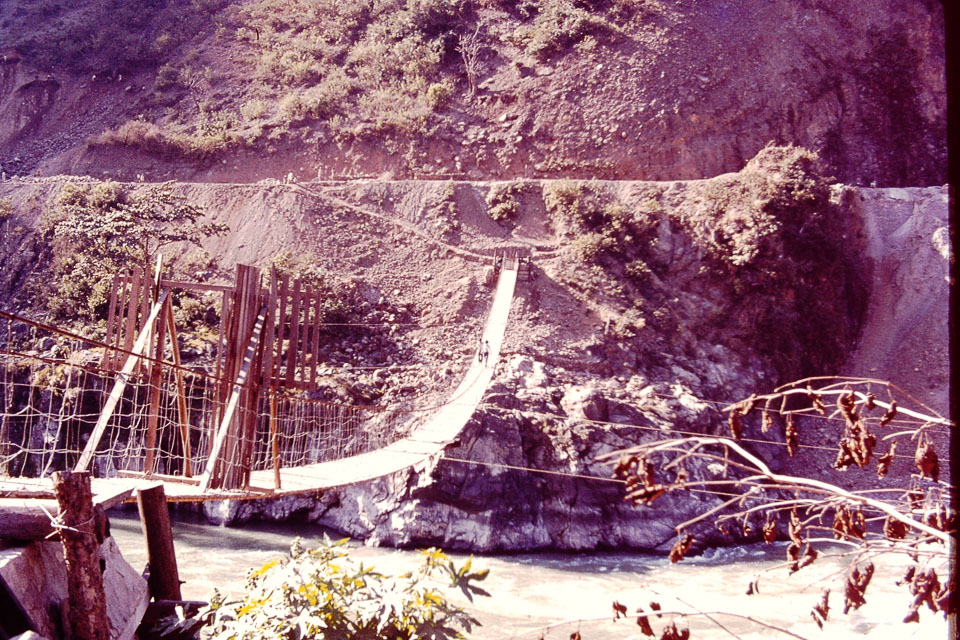Caption: Date: 1972 Location: Kavrepalanchok Description: Bridge with gate over the Sun Kosi river. Keywords: Mike Furst, Nepal Photo History Project, Peace Corp Photo History, bridge, community