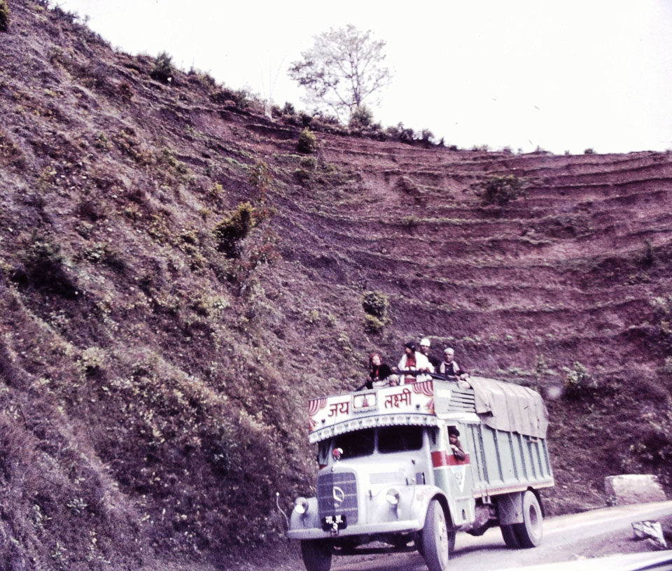 Caption: Date: 1970 Location: Kathmandu Description: Truck on the Rajpath with passengers on top. Keywords: Mike Furst, Nepal Photo History Project, Peace Corp Photo History, transportation, truck