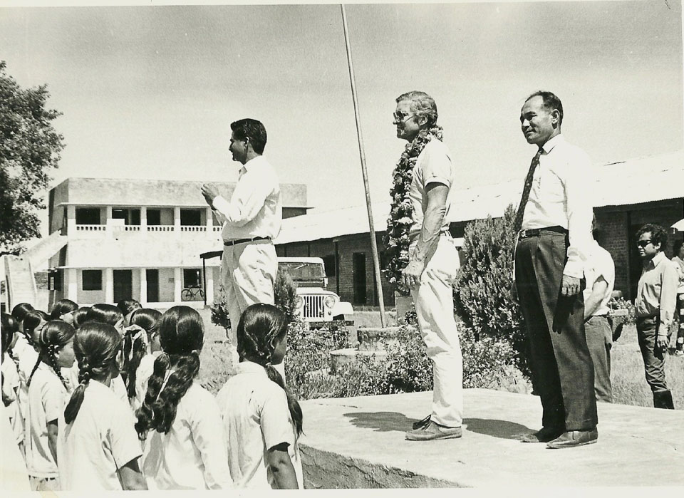 Caption: Date: 1970-09 Location: Bhairahawa, Rupandehi Description: United States Senator Charles Percy and Nepali officials addressing girl students at Paklihawa Vocational High School, which was a school established for students of British Gurkha solders. Keywords: Mike Furst, Nepal Photo History Project, Peace Corp Photo History, People, community, event, named person, school