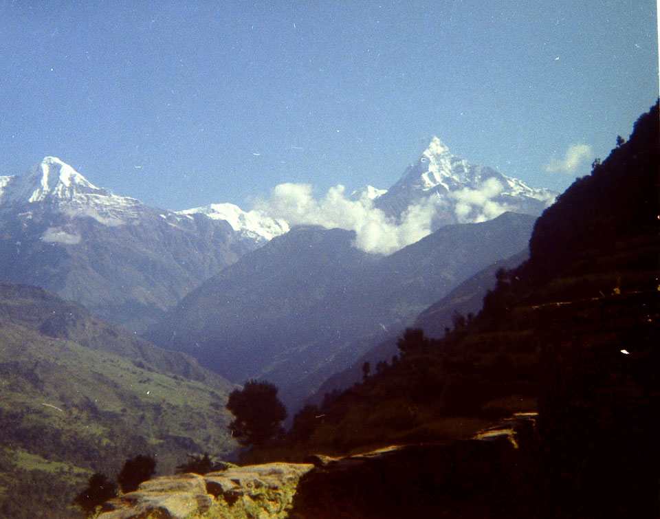Caption: Date: 1971-1972 Location: Kaski Description: View north of the Modi Khola valley with Hiun Chuli on left and Machhapuchchhre on the right. Keywords: Mike Furst, Nepal Photo History Project, Peace Corp Photo History, countryside, landscape, named mountain