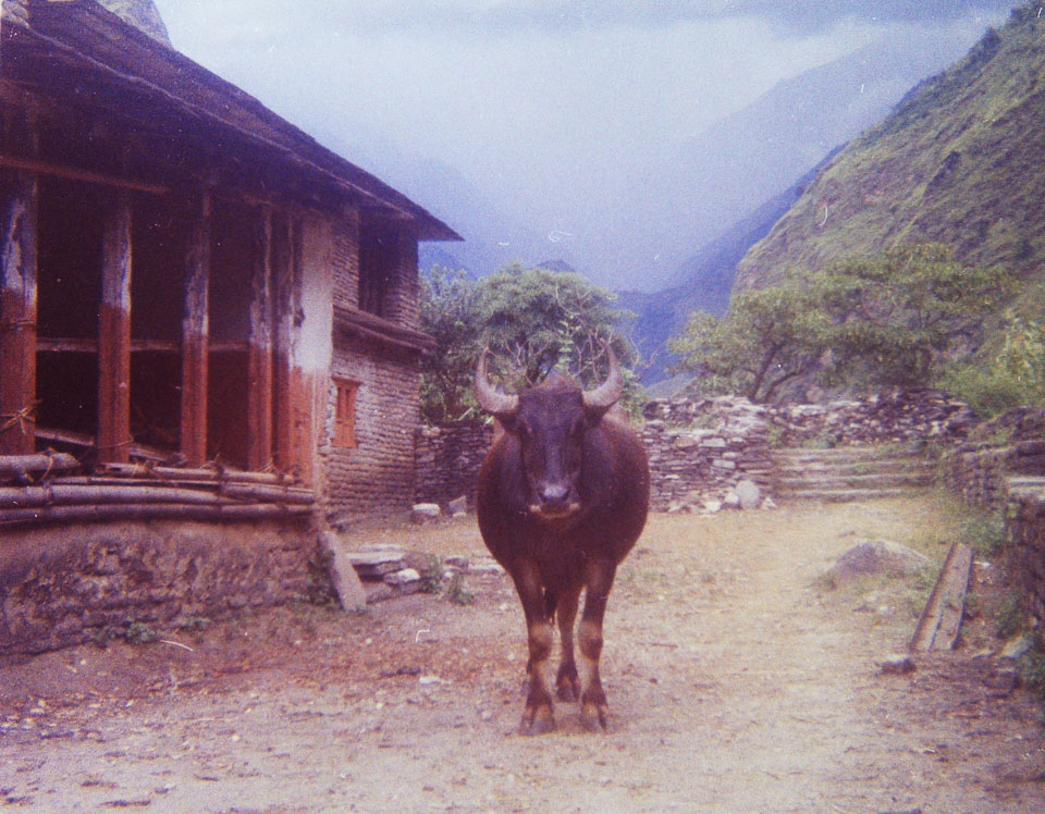 Caption: Date: 1971-1972 Location: Kaski Description: Water buffalo facing camera straight on. On the trail to Jomsom. Keywords: Mike Furst, Nepal Photo History Project, Peace Corp Photo History, agriculture, animal, footpath, transportation