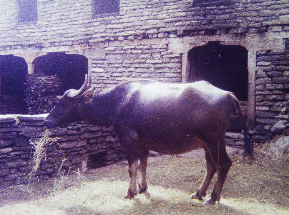 Caption: Date: 1971-1972 Location: Kaski Description: Water buffalo eating hay. On the trail to Jomsom. Keywords: Mike Furst, Nepal Photo History Project, Peace Corp Photo History, agriculture, animal