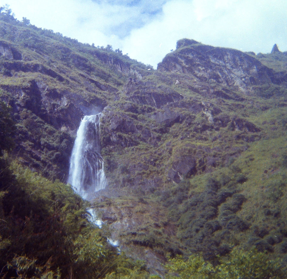 Caption: Date: 1971-1972 Location: Myagdi Description: Waterfall on route to Jomsom. Keywords: Mike Furst, Nepal Photo History Project, Peace Corp Photo History, landscape, waterfall