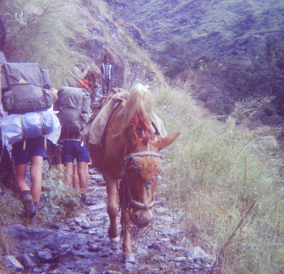Caption: Date: 1971-1972 Location: Myagdi Description: Pack animal, on the trail to Jomsom. Students from Lincoln School, Kathmandu, left. Keywords: Mike Furst, Nepal Photo History Project, Peace Corp Photo History, pack animal, transportation