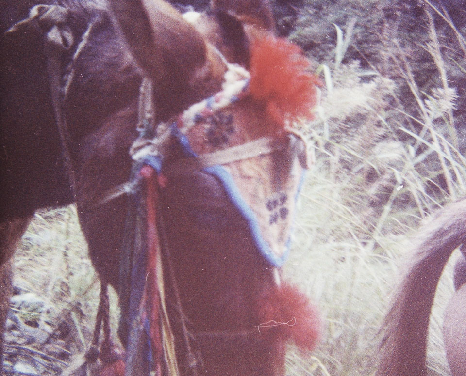 Caption: Date: 1971-1972 Location: Myagdi Description: Head dress on pack animal, on the trail to Jomsom. Keywords: Mike Furst, Nepal Photo History Project, Peace Corp Photo History, pack animal, transportation