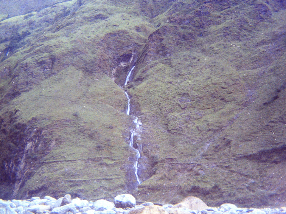 Caption: Date: 1971-1972 Location: Myagdi Description: Waterfall running off hillside, on the trail to Jomsom. Keywords: Mike Furst, Nepal Photo History Project, Peace Corp Photo History, landscape, waterfall