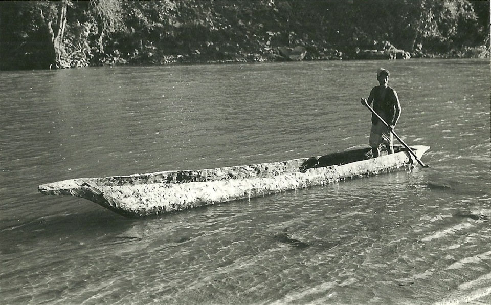 Caption: Date: 1971-1972 Location: Kavrepalanchok Description: Man standing in canoe on Sun Kosi River. Keywords: Mike Furst, Nepal Photo History Project, Peace Corp Photo History, river crossing, transportation