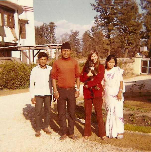 Caption: Date: 1972 Location: Kathmandu, Kathmandu Description: Nunchman, second from right, was cook at the home of Nepal Peace Corps Director, Mike Furst. Next right is Terry Furst, daughter of Mike Furst, holding family dog Kuni. To her right is Shanti, who also worked as a cook at the Furst home. Picture taken outside the Furst’s home. Keywords: Mike Furst, Nepal Photo History Project, Peace Corp Photo History, People, named person