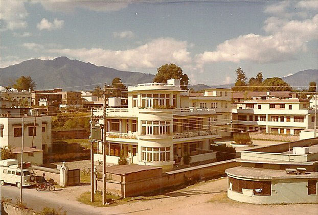 Caption: Date: 1971-02 Location: Kathmandu, Kathmandu Description: Peace Corps Office. Nagarjung in the background left. Keywords: Mike Furst, Nepal Photo History Project, Peace Corp Photo History, community, government building, landscape, named mountain