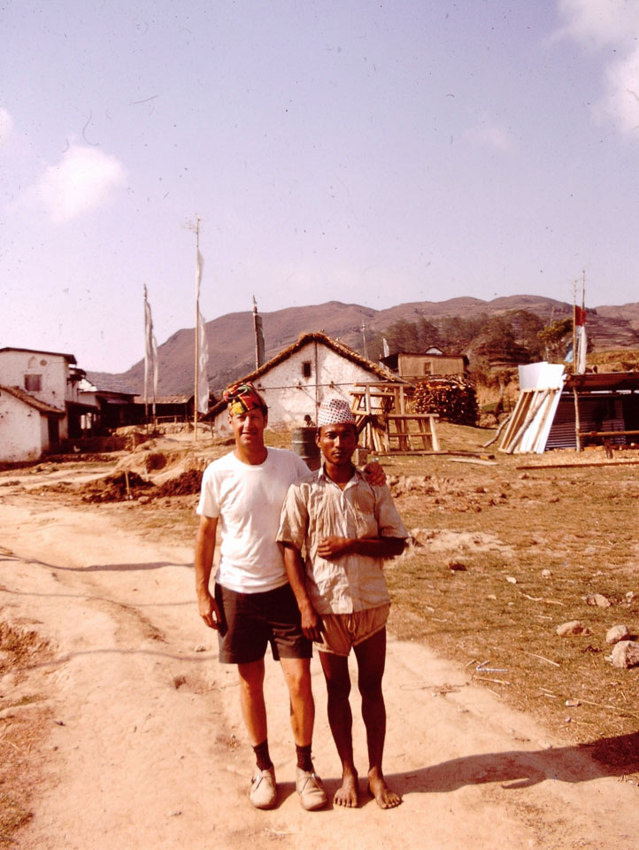 Caption: Date: 1970-04 Location: Hile, Dhankuta Description: Mike Furst and man, perhaps his porter, on the main street of Hile. Photo was taken before Mike Furst officially assumed role as Director of Nepal Peace Corps. Keywords: Mike Furst, Nepal Photo History Project, PC volunteer, Peace Corp Photo History, People, named person