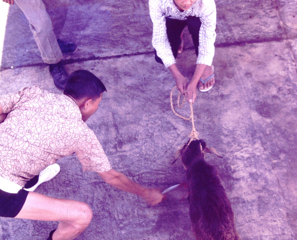 Caption: Date: 1970 Location: Kathmandu, Kathmandu Description: Goat being sacrificed as part of a blessing ceremony for a DC3 at Tribhuvan Airport, perhaps during Dashain. Keywords: Mike Furst, Nepal Photo History Project, Peace Corp Photo History, agriculture, airfield, animal, event, puja, religious service, transportation