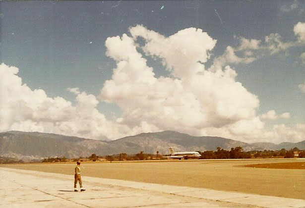 Caption: Date: 1971-02 Location: Kathmandu, Kathmandu Description: Policeman or soldier watching jet take off from Tribhuvan Airport. Keywords: Mike Furst, Nepal Photo History Project, Peace Corp Photo History, People, airfield, airplane, police, transportation