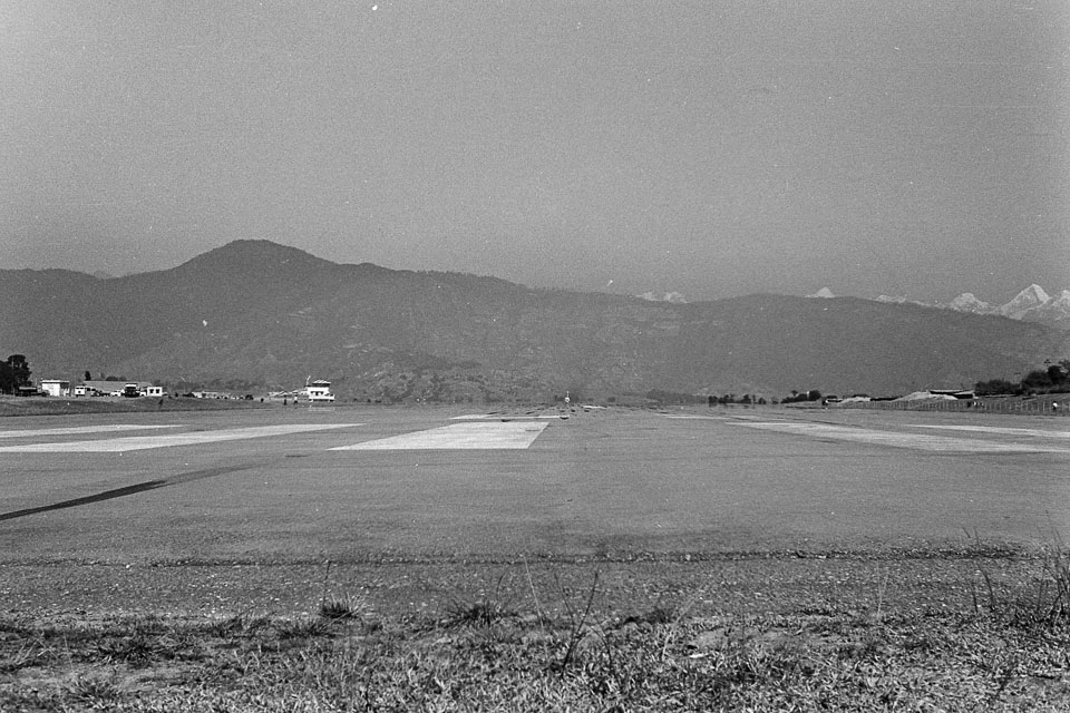 Caption: Date: 1972 Location: Kathmandu, Kathmandu Description: Thai Airways jet ready for takeoff at Tribhuvan Airport. Picture taken from the end of the runway. Keywords: Mike Furst, Nepal Photo History Project, Peace Corp Photo History, airfield, airplane, transportation