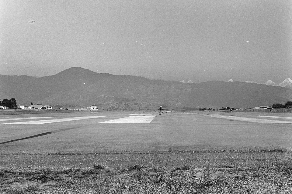 Caption: Date: 1972 Location: Kathmandu, Kathmandu Description: Thai Airways jet taking off at Tribhuvan Airport. Picture taken from the end of the runway. Keywords: Mike Furst, Nepal Photo History Project, Peace Corp Photo History, airfield, airplane, transportation