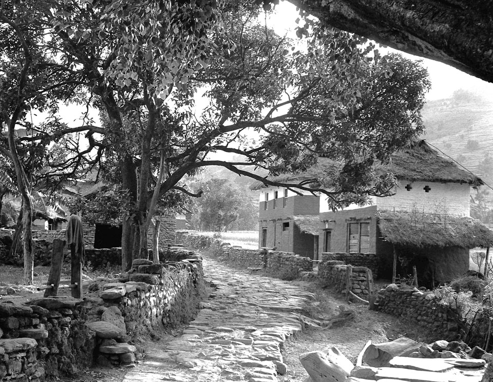 Caption: Date: 1971 Location: Kaski Description: Stone walkway through village in Pokhara Valley. Keywords: Mike Furst, Nepal Photo History Project, Peace Corp Photo History, community, footpath, street scene