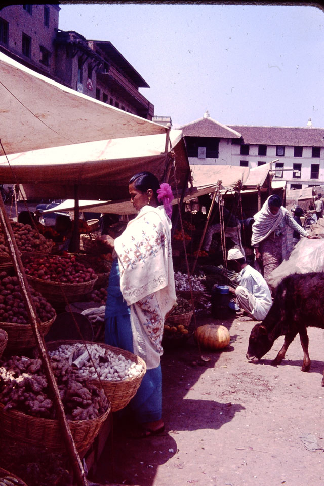 Caption: Date: 1971 Location: Kathmandu, Kathmandu Description: Basantapur market. Keywords: Mike Furst, Nepal Photo History Project, Peace Corp Photo History, commerce, haat, market
