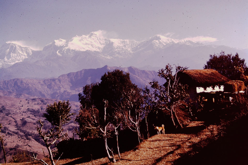 Caption: Date: 1971-02 Location: Lamjung Description: Hillside home with dog and Manaslu Himal range behind. Keywords: Mike Furst, Nepal Photo History Project, Peace Corp Photo History, agriculture, animal, countryside, home life, house exterior, landscape