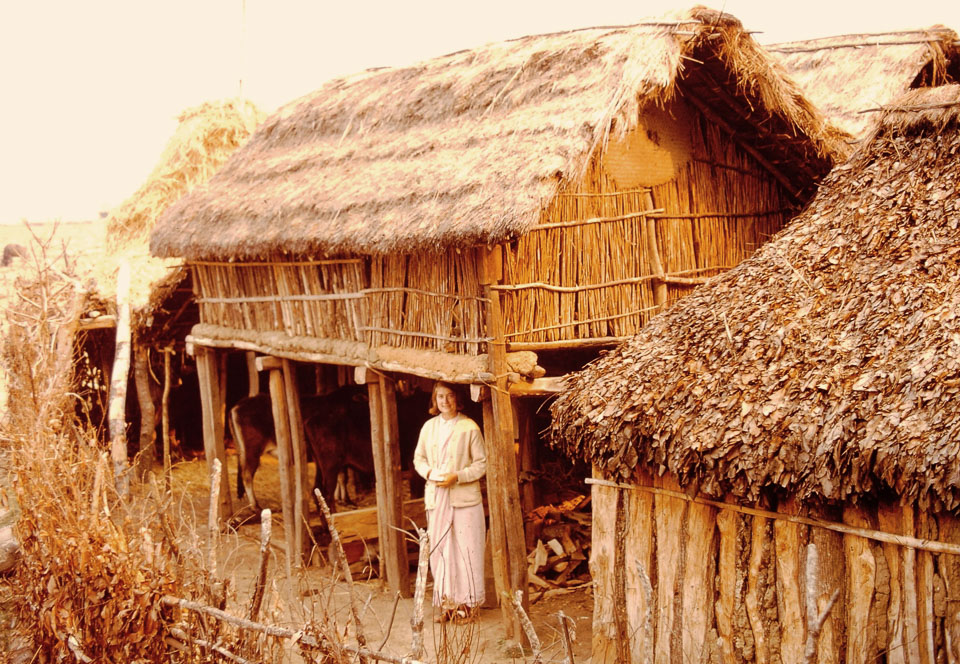 Caption: Date: 1970-05 Location: Lekhnath, Kaski Description: Cow shed in Rajako Chautara. Peace Corps Volunteer Jane Turner, standing. Firewood to her right. Keywords: Mike Furst, Nepal Photo History Project, PC volunteer, Peace Corp Photo History, People, home life, house exterior, named person