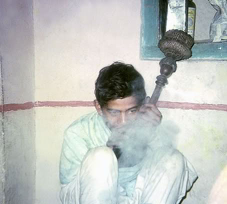 Date: 1967 Location"Sainbu, Lalitpur Description: Kaji Babu smoking a hookah