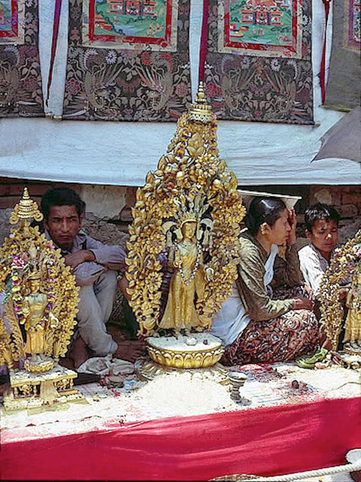 Date: 1967-1968 Location: Swayambhu, Kathmandu Description: Sacred Buddhist statues and thankas on display at Buddha Jayanti.