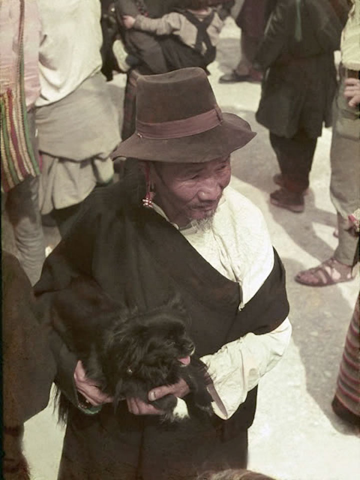 Date: 1968 Location: Kathmandu, Kathmandu Description: Tibetan with a dog, probably a Lhasa Apso.