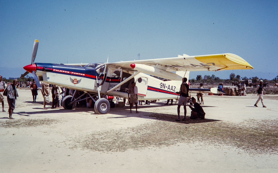 Caption: Date: 1973 Location: ?? Description: Pilatus-Porter single engine short take-off and landing (STOL) aircraft. Keywords: Nepal Photo History Project, Peace Corp Photo History, Rich Pfau, airplane, transportation